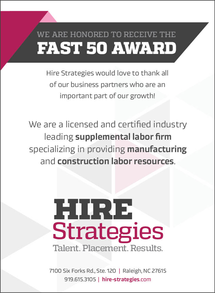 Hire Strategies is honored to announce that we have been named one of the Fast 50 companies by the Triangle Business Journal for 2017. This recognition highlights our continued growth, commitment to excellence, and unwavering dedication to serving our clients with innovative staffing solutions.